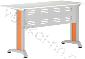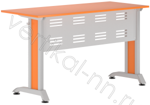 Размеры, мм: Ширина: 1200 Глубина: 500; Высота: гр. 6 высота 760  Стол ученический, 2-местный изготавливается на металлическом каркасе с прямоугольной столешницей и передней перфорированной панелью. Материал столешницы - ламинированная плита ДСП толщиной 16 мм (25 мм по запросу) класса эмиссии Е1. Цвет по согласованию. Кромка ПВХ толщиной 2 мм. Возможен вариант столешницы со скругленными углами.