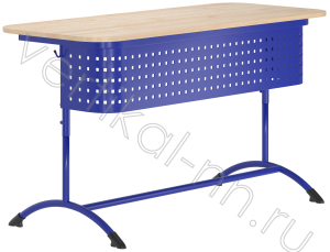 Стол ученический, 2-х местный изготавливается на металлическом каркасе с прямоугольной столешницей и передней панелью. Каркас цельносварной, изготавливается из металлической трубы, круглого сечения. Каркас основания столешницы изготовлен из трубы плоскоовального сечения. Экран стола – стальной перфорированный лист. Используется ламинированная плита ДСП толщиной 16 мм (22 мм, 25 мм по запросу) класса эмиссии Е1. Цвет ЛДСП стандартный "Ольха", "Клен", «Дуб молочный», «Бук Бавария», Серый, Белый, возможен вариант нестандартного цветного исполнения, по согласованию. Варианты исполнения столешницы 1. со скругленными углами (указана стоимсоть) 2-ой вариант без скругления. Столешница облицована кромкой ПВХ толщиной 2 мм. Для изготовления используются материалы, разрешенные к применению органами санитарно- эпидемиологического надзора. На свободных концах труб установлены заглушки из ударопрочных полимеров. Стойки имеют полимерные подпятники, не повреждающие напольных покрытий.