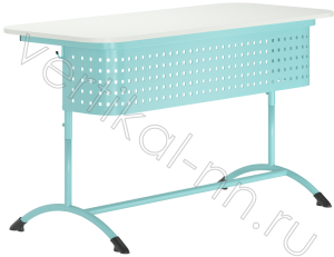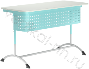Стол ученический, 2-х местный изготавливается на металлическом каркасе с прямоугольной столешницей и передней панелью. Каркас цельносварной, изготавливается из металлической трубы, круглого сечения. Каркас основания столешницы изготовлен из трубы плоскоовального сечения. Экран стола – стальной перфорированный лист. Используется ламинированная плита ДСП толщиной 16 мм (22 мм, 25 мм по запросу) класса эмиссии Е1. Цвет ЛДСП стандартный "Ольха", "Клен", «Дуб молочный», «Бук Бавария», Серый, Белый, возможен вариант нестандартного цветного исполнения, по согласованию.